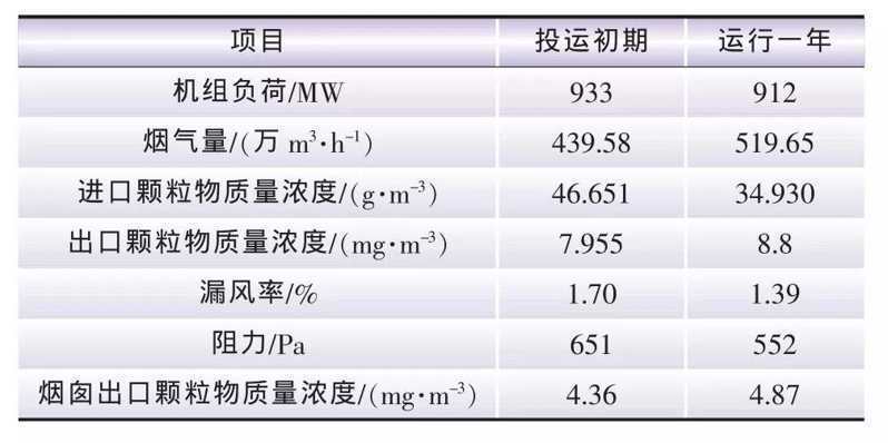 河南平頂山發(fā)電分公司2×1 000 MW機組超低排放改造工程,是國內(nèi)首臺1 000 MW等級超凈電袋項目,于2015年改造完成并投運。其燃用煤種為山西長治貧煤,其灰分高達(dá)39.78%,飛灰中SiO2和Al2O3含量高,比電阻較大,是典型的劣質(zhì)煤。該工程原采用3室5電場靜電除塵器,并經(jīng)過低低溫電除塵提效改造,但未能達(dá)標(biāo)排放,好終采用超凈電袋技術(shù)方案再次提效改造[19]。2號爐超凈電袋投運初期和運行一年的性能測試結(jié)果見表2。測試表明,投運初期和運行一年后的各項性能都非常穩(wěn)定地滿足設(shè)計要求,除塵器出口及煙囪出口顆粒物排放均達(dá)到超低排放要求。