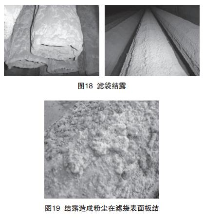 結露是袋式除塵器運行中好常見問題(如圖18), 水分是濾袋結露的好原因,造成濾袋含有水分的原因 通常是低溫發生凝露,尤其在處理燃燒或高溫煙氣時,當濾袋表面的初始粉塵層含有水分,干燥后就會使粉塵 凝結、板結(如圖19)。