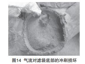 由于噴吹管內的氣流為橫向運行,當導流管設置不 當時,產生的噴吹管氣流就不是垂直而是傾斜向下噴入 濾袋,就會造成袋口部位下方約300mm處產生由內向外 的破損(如圖12、13所示)。