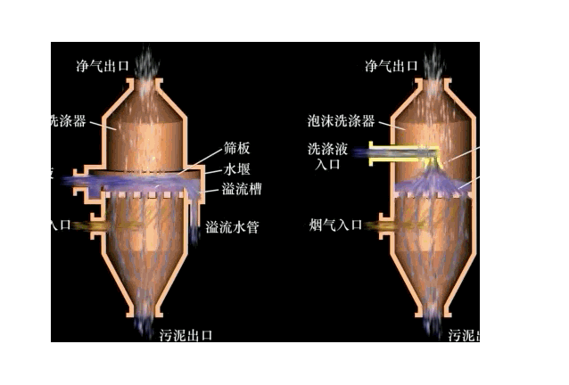在逆流式噴霧塔中,含塵氣體向上運(yùn)動,液滴由噴嘴噴出向下運(yùn)動。因液滴和顆粒之間的慣性碰撞、攔截和凝聚等作用,使較大的的粒子被液滴捕集。噴霧塔具有結(jié)構(gòu)簡單、壓力損失小、操作穩(wěn)定等特點(diǎn),經(jīng)常與高效洗滌器聯(lián)用捕集粒徑較大的顆粒。